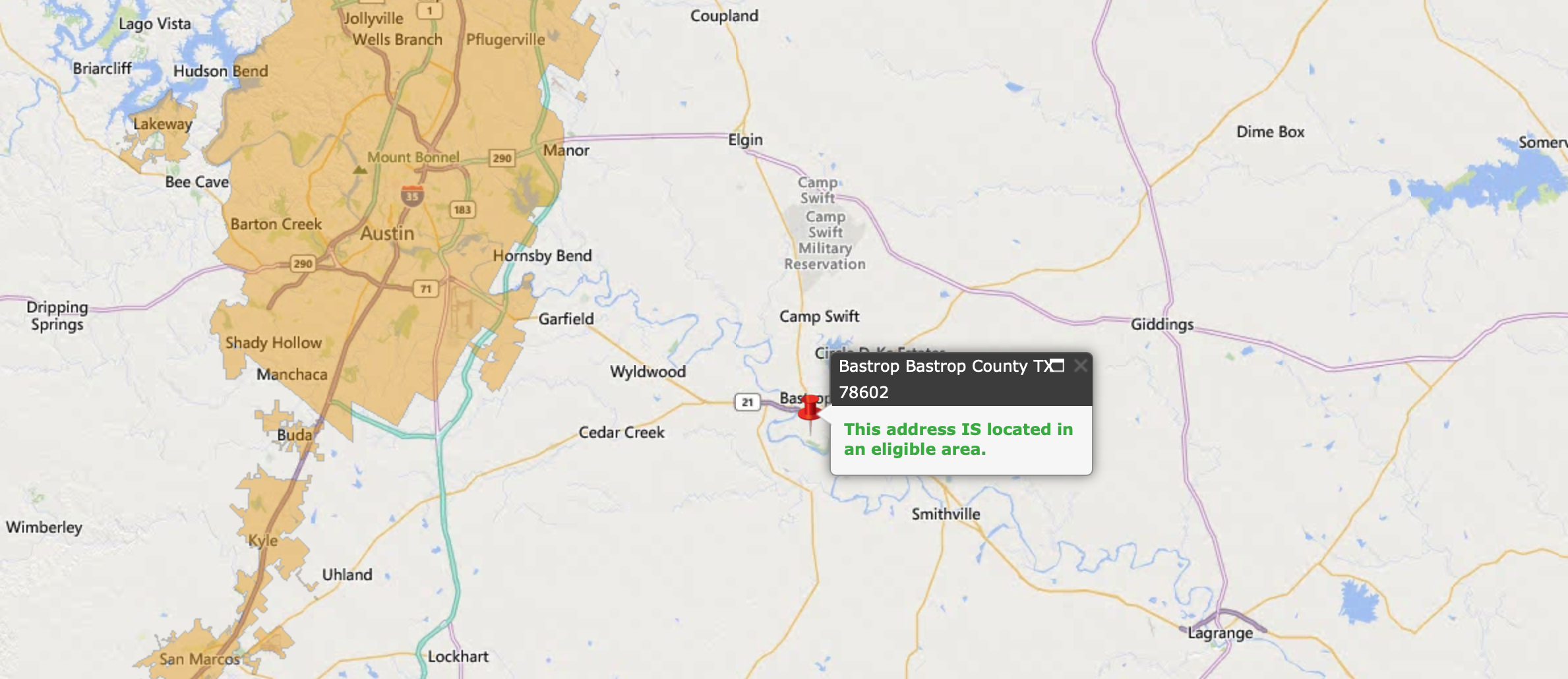 Many areas in Bastrop County qualify for USDA financing, especially outside the immediate city center.
